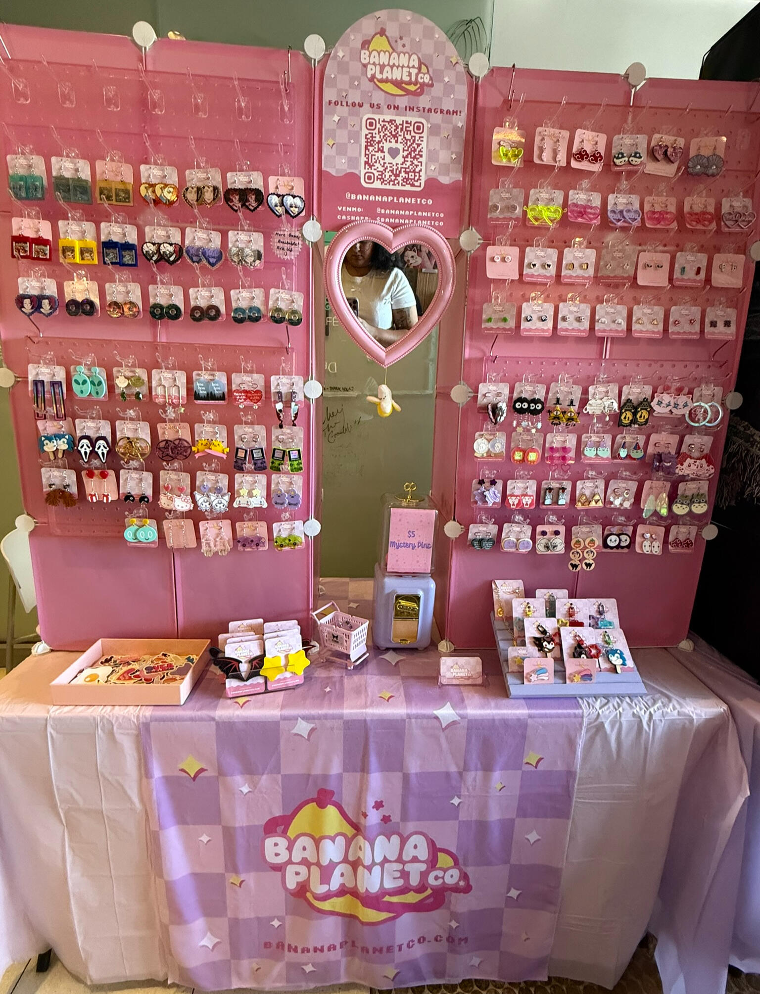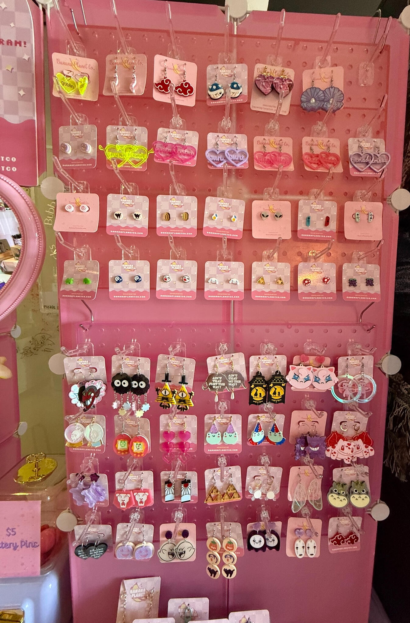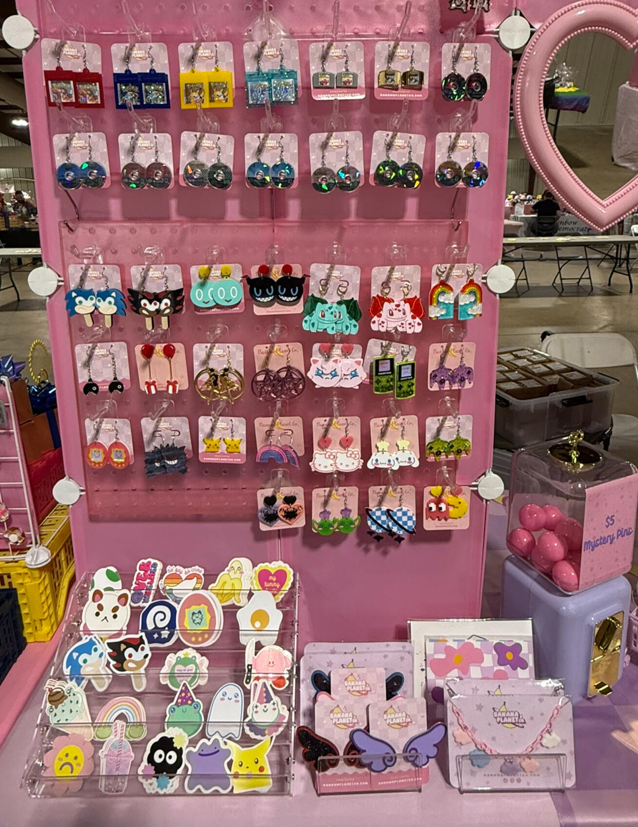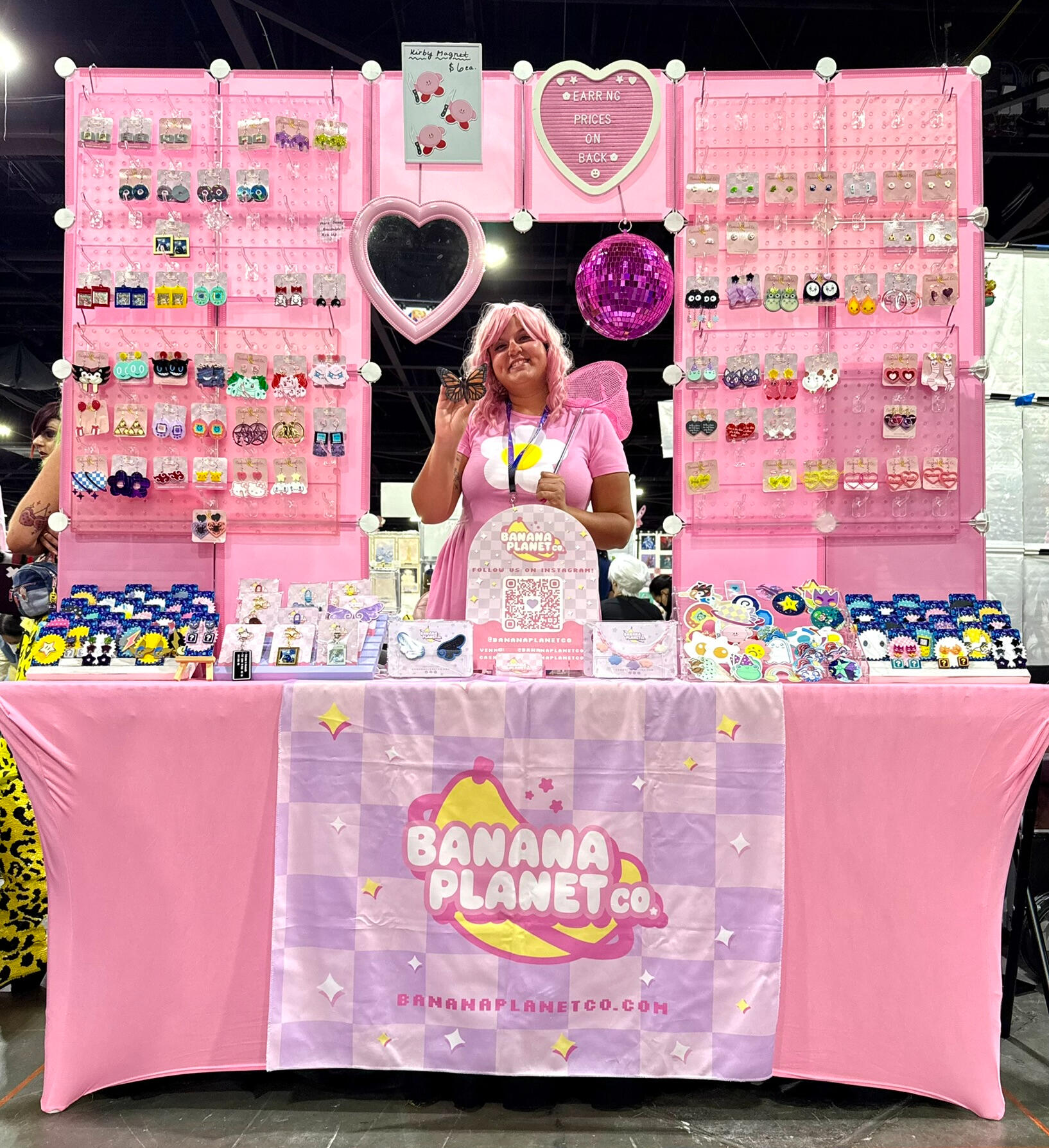 Banana Planet Co. is POC, LGBTQ+, and woman owned and operated. The owner, Sarah, and her partner, Jose, specialize in designing and creating handmade acrylic jewelry and accessories inspired by gaming, anime, pop culture, and all things cute. Their items include earrings, necklaces, pins, hair clips, key chains and stickers. Banana Planet Co. can be found vending at local markets and conventions in the Southeast US.